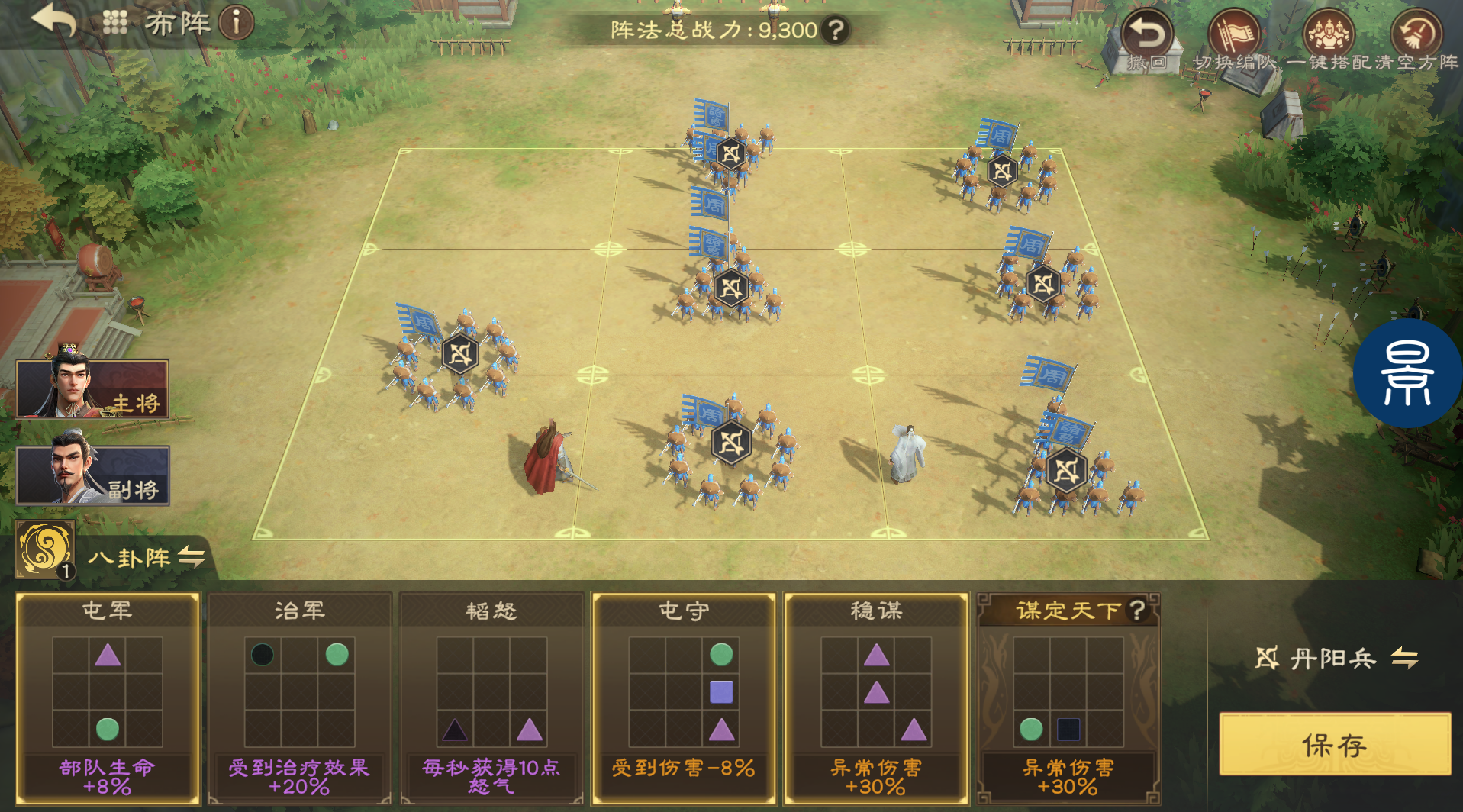 周瑜的“减怒”技能需要稳定的灼烧效果来支持,而八卦阵在部队普攻时有概率给目标添加灼烧状态,这样不仅能提升灼烧的覆盖率,还能与异常体系完美契合。推荐的阵型有屯军、屯守和稳谋。如果你激活了“谋定天下”的羁绊,那么选择屯守、稳谋和谋定天下组合将会更为有效。