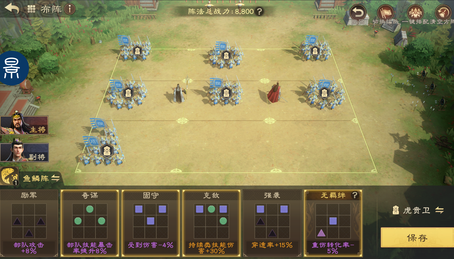 如果你的阵容没有八卦阵,鱼鳞阵也是一个不错的选择。此阵法能够提高异常伤害和怒气获取,同时通过主动技能和异常状态的附加来造成更多伤害。推荐的阵型有奇谋、固守、克敌和无羁绊。如果你的阵容中激活了“谋定天下”(例如诸葛亮或司马懿),那么选择谋定天下、固守和克敌的组合会更加理想。