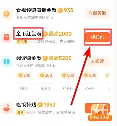 2、进入福利页面后,找到“金币雨”选项,点击右侧的【领】按钮,准备迎接雨的降临!