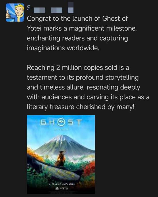 Olimac在X(原推特)上分享了这则动态,并表示帖子中的内容与配图都相当奇特,但提到的销量数字与业内流传的说法基本一致。这让不少玩家和业内人士开始猜测,这是否意味着《羊蹄山之魂》正在迎来一波新的热潮。