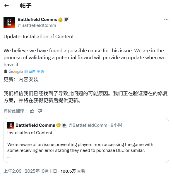 对此,《战地》的通讯账号作出了回应:“我们已知部分玩家在进入游戏时出现需购买DLC或类似提示的问题。团队正在积极调查,并将在后续发布更新。感谢玩家的耐心等待。”然而,EA目前尚未公布具体的修复时间表,这让不少玩家感到焦虑。