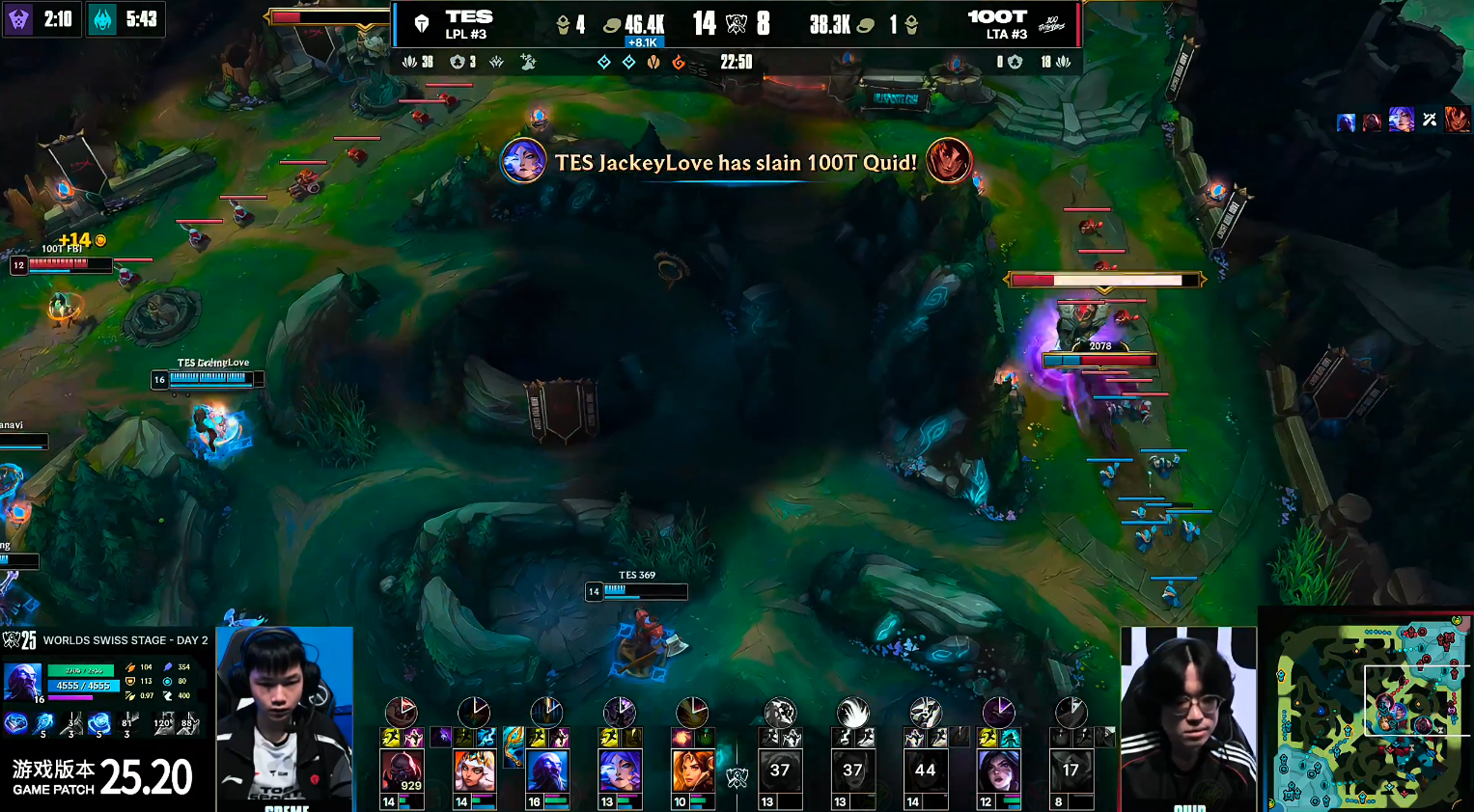随着比赛的推进,TES通过换线运营,在15分钟时便推掉了100T的上路二塔,而此时100T的外塔却一座未掉。紧接着在16分钟的河道团战中,369的赛恩成功搅乱了100T的阵型,帮助TES再次控下第三条小龙,并轻松拿下峡谷先锋。